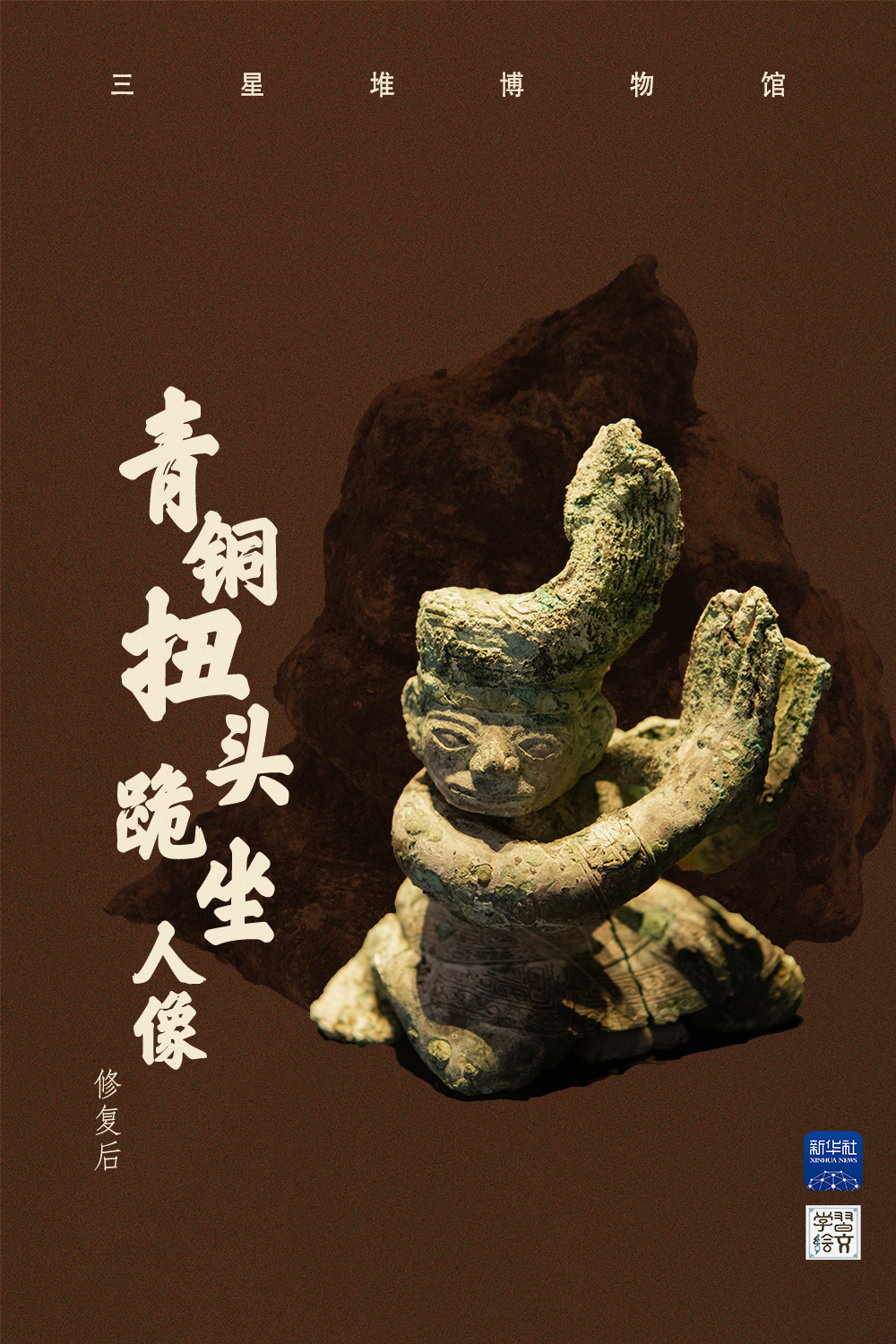 這是三星堆博物館文物保護(hù)與修復(fù)館拍攝的修復(fù)后的青銅扭頭跪坐人像。