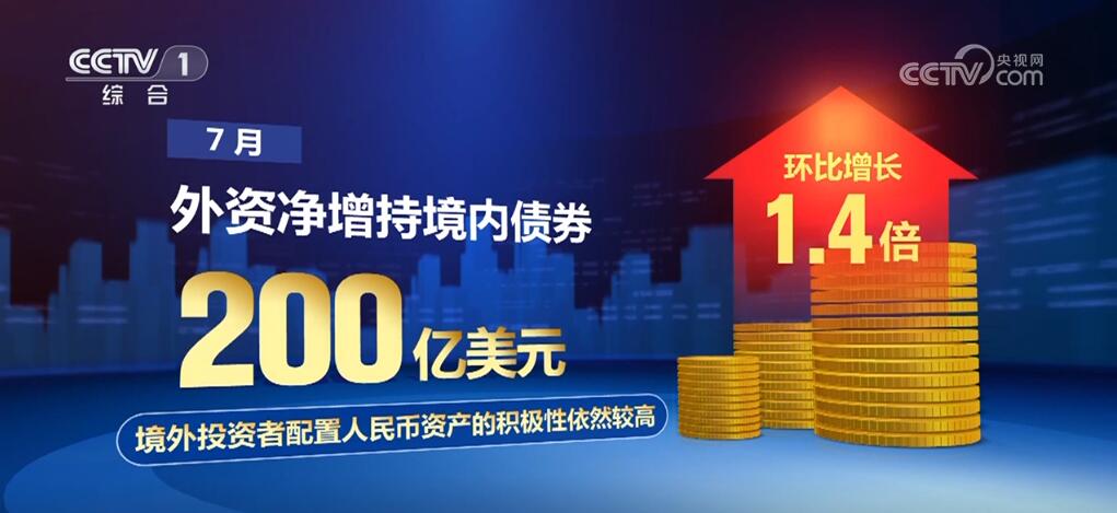 國(guó)家外匯管理局?jǐn)?shù)據(jù)顯示,7月,外資凈增持境內(nèi)債券200億美元,環(huán)比增長(zhǎng)1.4倍。境外投資者配置人民幣資產(chǎn)的積極性依然較高。