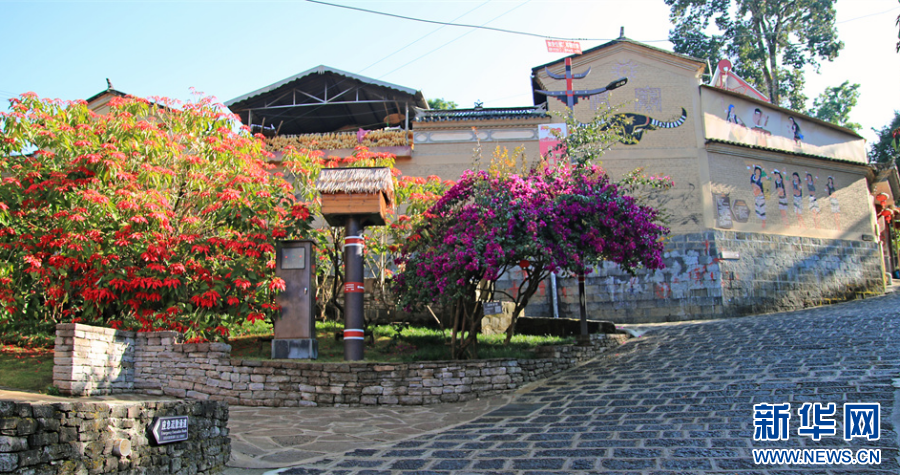 ??來(lái)到國(guó)門新村,遠(yuǎn)遠(yuǎn)便能看到由“刀山火?!薄⒒鹁?、三弦琴、箭及裝飾物組成“一把弩”形狀的寨門。