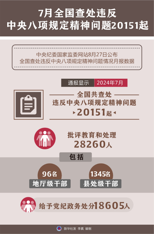 中央紀(jì)委國(guó)家監(jiān)委網(wǎng)站27日公布全國(guó)查處違反中央八項(xiàng)規(guī)定精神問題情況月報(bào)數(shù)據(jù)。通報(bào)顯示,今年7月,全國(guó)共查處違反中央八項(xiàng)規(guī)定精神問題20151起,批評(píng)教育和處理28260人(包括96名地廳級(jí)干部、1345名縣處級(jí)干部),給予黨紀(jì)政務(wù)處分18605人。