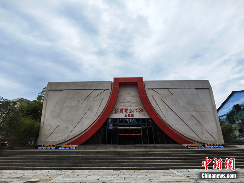 在當(dāng)年擺渡人們行舟悠游來去的渡口旁,一棟造型奇特的建筑映入采訪團(tuán)的眼簾——展館整體結(jié)構(gòu)形如“四”字,寓意“紅四軍”,中間紅色砌磚組成“八一”字樣,九面旗幟浮雕象征九條船載著紅軍渡江。