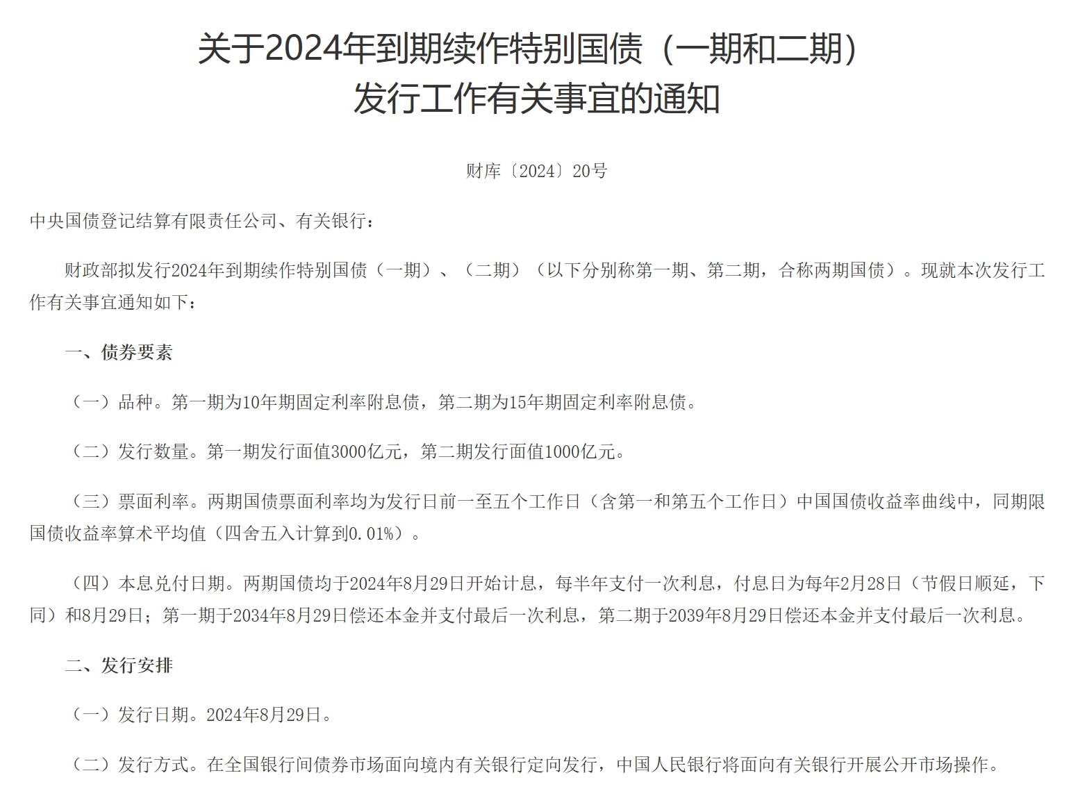 8月19日,財政部發(fā)布關于2024年到期續(xù)作特別國債發(fā)行工作有關事宜的通知。財政部擬發(fā)行2024年到期續(xù)作特別國債(一期)、(二期)。第一期為10年期固定利率附息債,第二期為15年期固定利率附息債。第一期發(fā)行面值3000億元,第二期發(fā)行面值1000億元。兩期國債票面利率均為發(fā)行日前一至五個工作日(含第一和第五個工作日)中國國債收益率曲線中,同期限國債收益率算術平均值(四舍五入計算到0.01%)。發(fā)行日期為2024年8月29日,在全國銀行間債券市場面向境內(nèi)有關銀行定向發(fā)行,中國人民銀行將面向有關銀行開展公開市場操作。