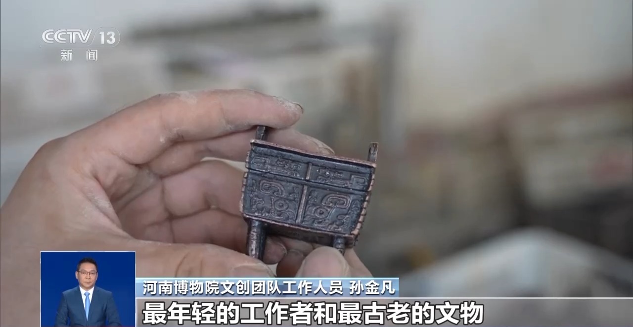 河南博物院文創(chuàng)團(tuán)隊(duì)工作人員 孫金凡:做成的時(shí)候感覺(jué)很有成就感,最年輕的工作者和最古老的文物,我覺(jué)得我這對(duì)CP組得還真的挺不錯(cuò)的。