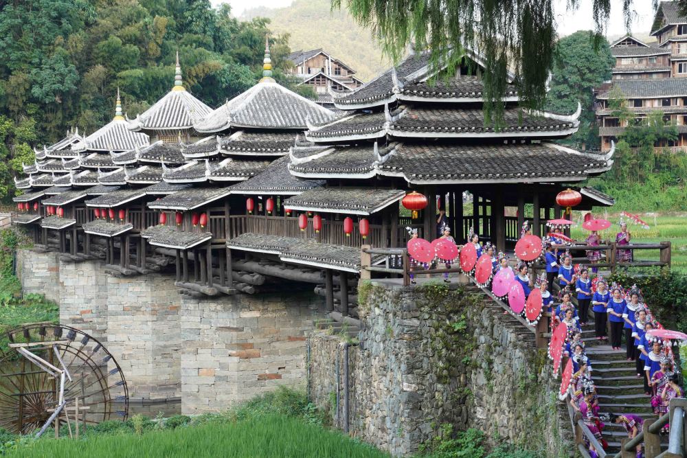 侗寨跨水而建。進(jìn)入程陽八寨,首先要走過今年迎來100歲生日的程陽永濟(jì)橋。此橋是樓閣式建筑,整座橋梁搭建時不用一釘一鉚,主要由木料和石料建成,橋長近80米,寬近4米,高近12米,是我國建筑藝術(shù)中的珍品。
