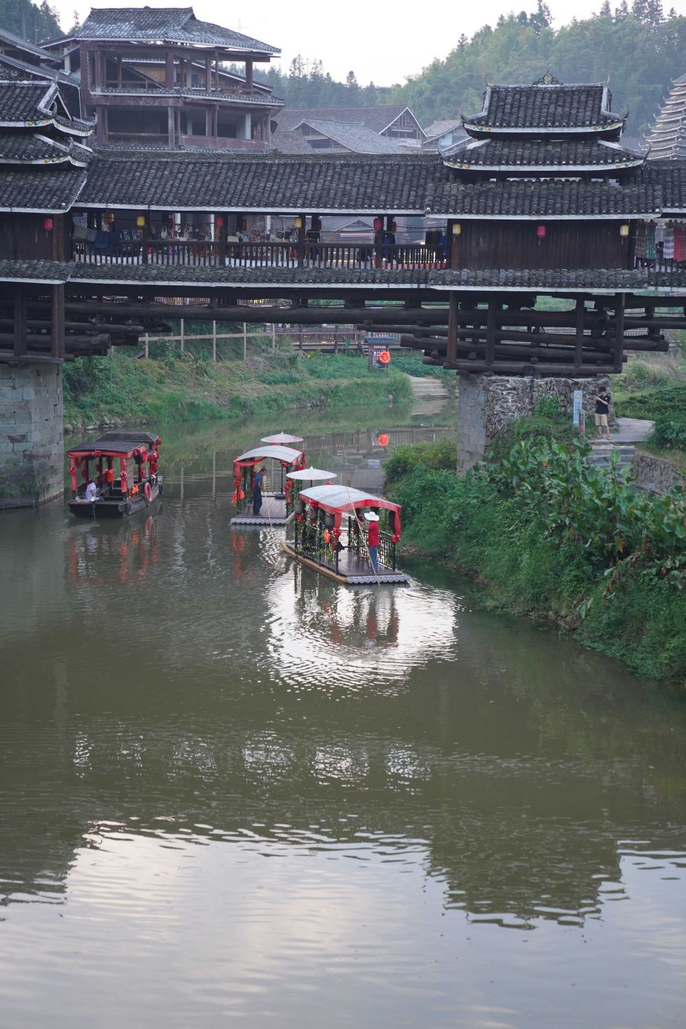 風(fēng)雨橋上,侗家兒女著盛裝、佩銀飾,待游人行至橋前,紅傘輕搖,高音起調(diào),低音輕和,嘹亮婉轉(zhuǎn)的迎賓歌唱響,獻(xiàn)上侗鄉(xiāng)迎客的最高禮遇。