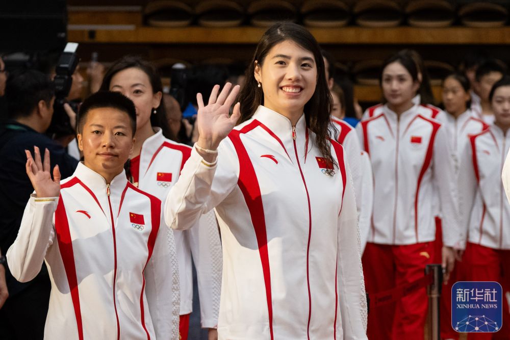 ↑9月1日,游泳運(yùn)動員張雨霏(前右)在活動中揮手致意。