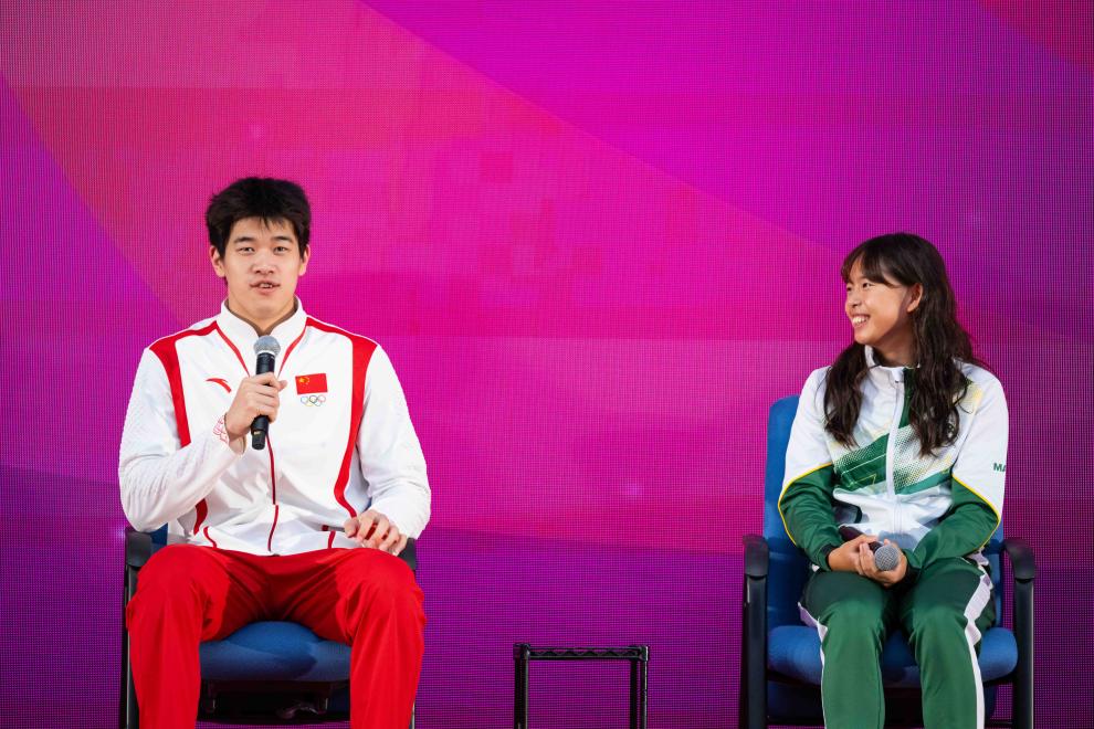 9月1日,游泳運(yùn)動(dòng)員潘展樂(lè)(左)在活動(dòng)中回答澳門運(yùn)動(dòng)員的提問(wèn)。新華社記者 張金加 攝