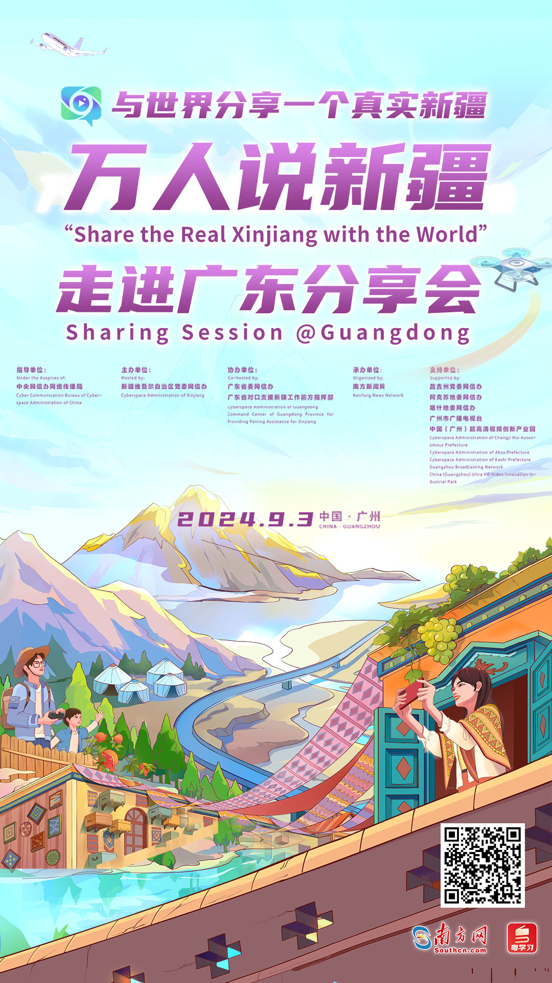 在交流互鑒中把新疆溫柔地說與全世界,在新粵兩地合作中感悟跨“粵”千里的援疆故事。“萬人說新疆”走進(jìn)廣東分享會(huì)將于9月2日至3日在廣州舉行。此次活動(dòng)由新疆維吾爾自治區(qū)黨委網(wǎng)信辦主辦,廣東省委網(wǎng)信辦、廣東省對(duì)口支援新疆工作前方指揮部協(xié)辦,南方新聞網(wǎng)承辦。分享會(huì)從國(guó)內(nèi)知名學(xué)者、外籍專家、海內(nèi)外博主、援疆干部、港澳青年等不同視角,講述有溫度、有情懷、接地氣的美好新疆故事。