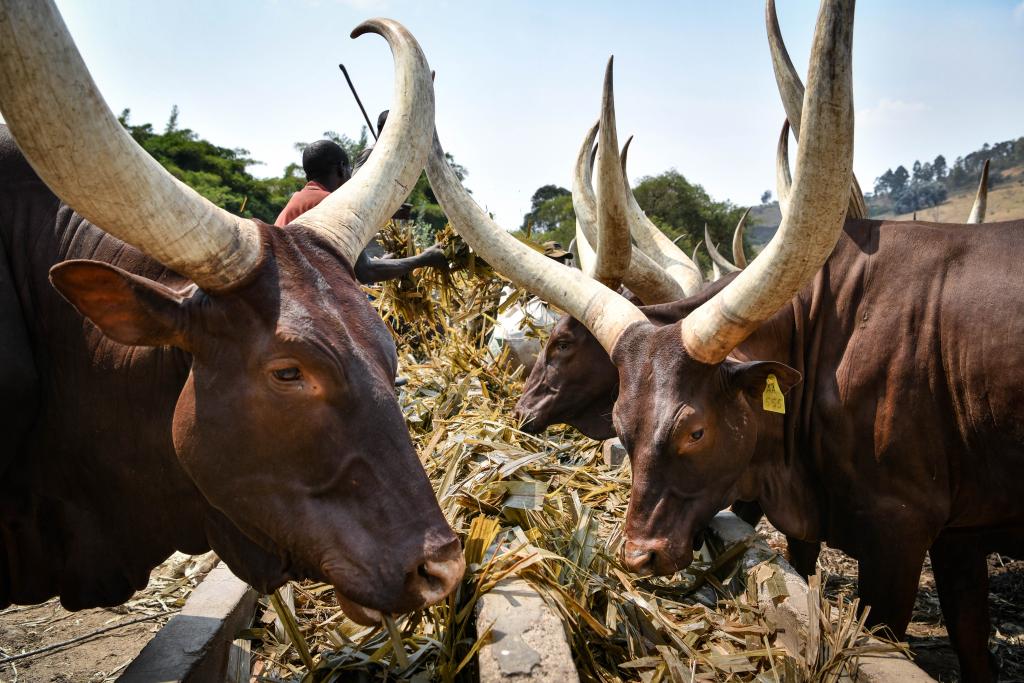 8月14日,在盧旺達(dá)南方省的一處牧場(chǎng),牲畜食用菌草飼料。