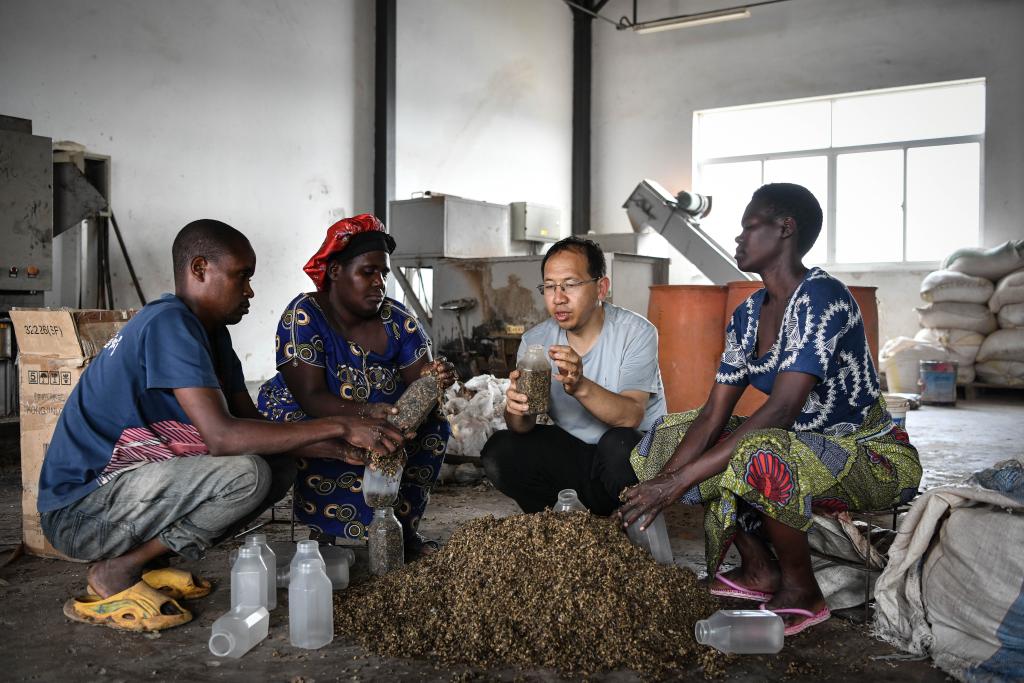 8月13日,在盧旺達(dá)南方省胡耶區(qū)的中國(guó)援盧農(nóng)業(yè)技術(shù)示范中心,菌草專(zhuān)家陳曉斌(右二)與當(dāng)?shù)剞r(nóng)民一起制作菌種培養(yǎng)料。