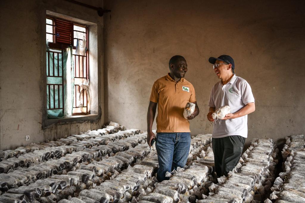 8月14日,在盧旺達(dá)南方省尼安薩區(qū)的一家食用菌培育工坊,菌草專(zhuān)家陳曉斌與工坊主人卡納尼·埃納尼交流。