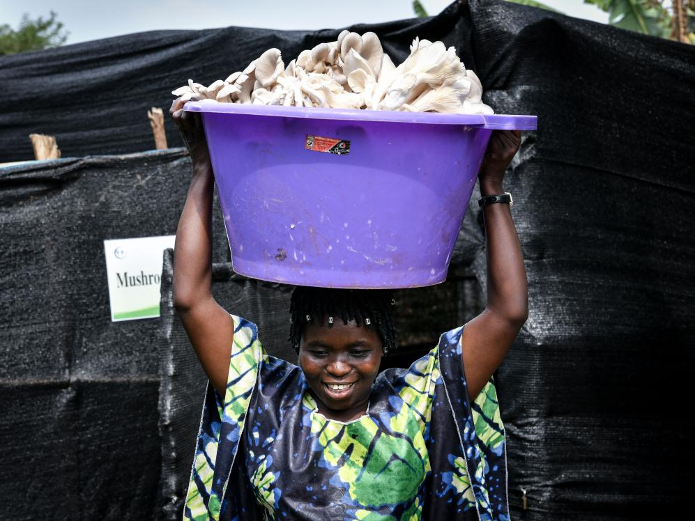 在中非共和國(guó)達(dá)馬拉市一處貧困村落里,法蒂姆·阿巴·雷基亞正在自家的菇棚內(nèi)收獲鮮菇。