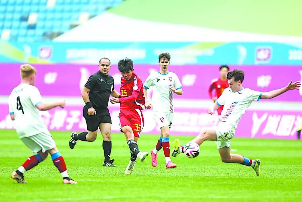 2024年國(guó)際中學(xué)生體育聯(lián)合會(huì)足球世界杯在遼寧省大連市舉行,中外球員角逐綠茵場(chǎng)。 遼寧省教育廳供圖