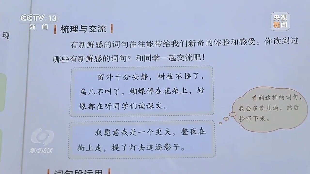 為了更好地檢驗(yàn)教材的適宜性,2023年下半年,教育部在全國(guó)范圍內(nèi)組織550多所學(xué)校、2000多名教師、10萬多名學(xué)生開展試教試用,組織500名中小學(xué)骨干教師和教研員進(jìn)行精細(xì)審讀。北京芳草地國(guó)際學(xué)校的語文教師試教了六年級(jí)下冊(cè)的第一單元。