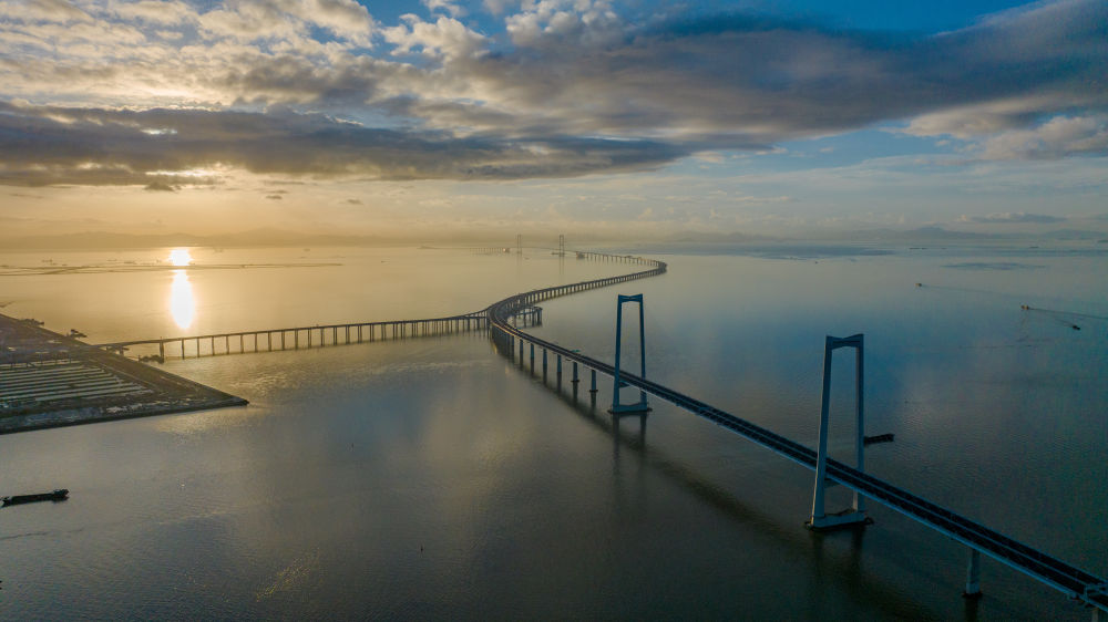 6月27日,沐浴在晨曦中的深中通道(無人機(jī)照片)。新華社記者毛思倩 攝