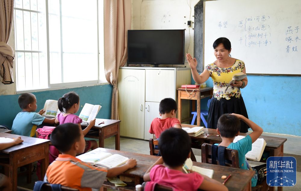 在廣西金秀瑤族自治縣忠良鄉(xiāng)更范教學(xué)點,“85后”老師盧秀芬在給學(xué)生上課(2019年6月5日攝)。