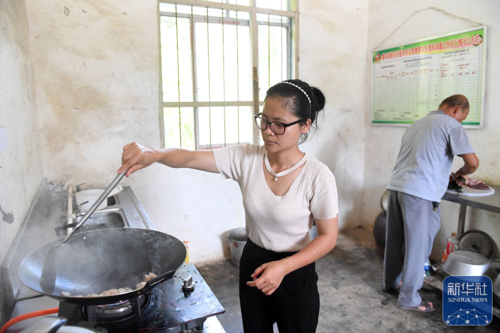 在廣西都安瑤族自治縣龍灣鄉(xiāng)琴棋小學(xué),“85后”老師藍巧春(左)在給學(xué)生做午飯(2017年8月31日攝)。