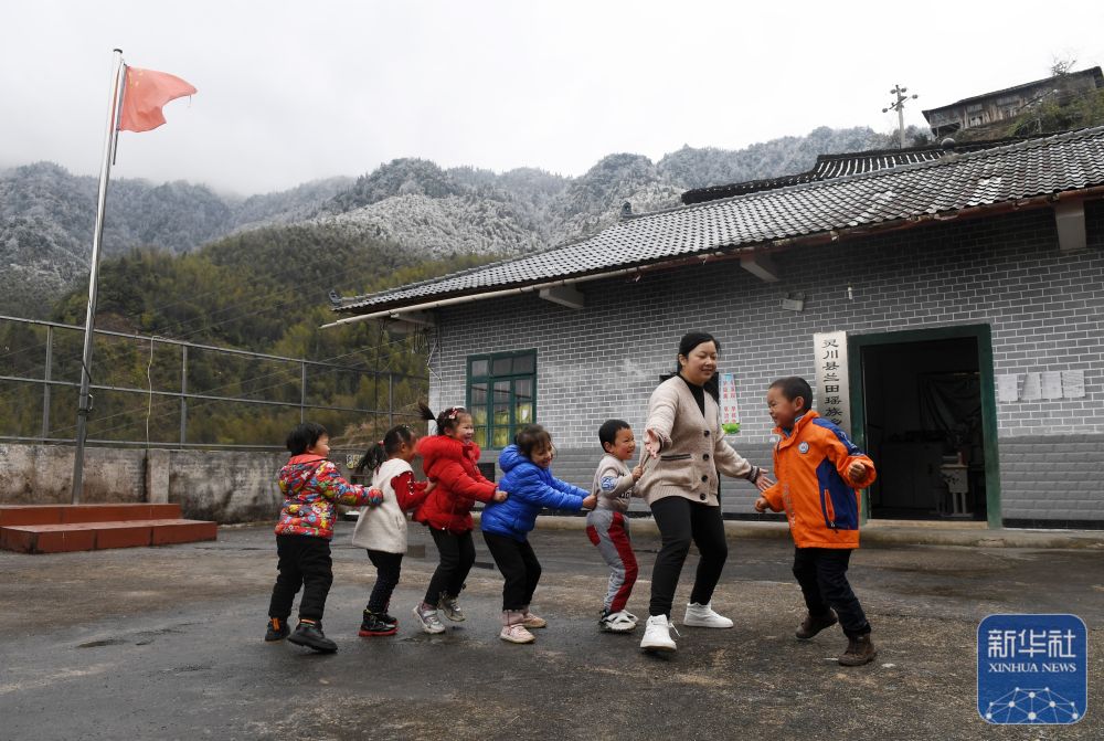 在廣西靈川縣蘭田瑤族鄉(xiāng)東良教學(xué)點,“85后”老師石夏月和學(xué)生做游戲(2022年2月24日攝)。