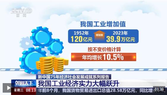 國家統(tǒng)計局昨天(10日)發(fā)布的新中國75年經(jīng)濟(jì)社會發(fā)展成就系列報告顯示,新中國成立75年以來,我國工業(yè)經(jīng)濟(jì)實現(xiàn)了規(guī)模總量的跨越式增長和發(fā)展質(zhì)量的顯著提升,由農(nóng)業(yè)國成長為世界第一制造業(yè)大國。