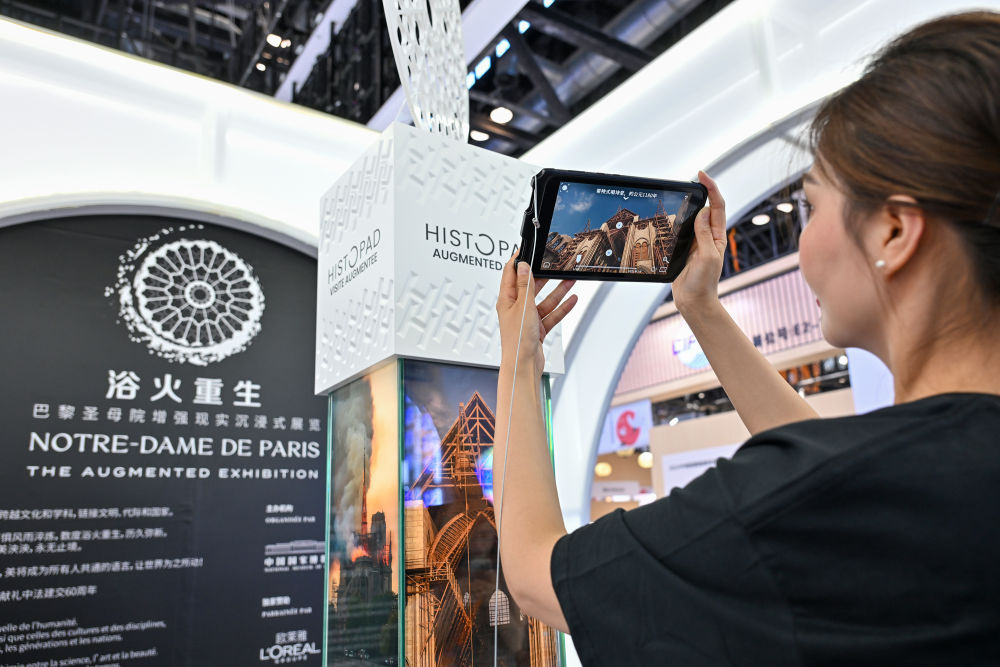 9月12日,法國國家館工作人員介紹“巴黎圣母院增強(qiáng)現(xiàn)實沉浸式展覽”。 新華社記者 李鑫 攝