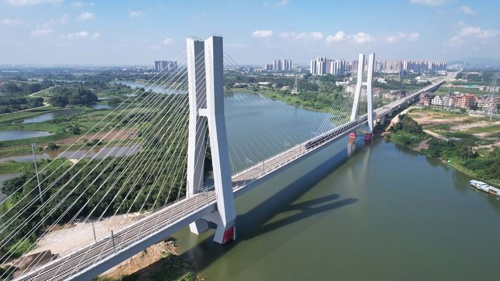 2023年9月26日,廣汕高鐵正式開(kāi)通運(yùn)營(yíng),列車經(jīng)過(guò)位于廣州市增城區(qū)的廣汕高鐵增江特大橋(無(wú)人機(jī)照片)。新華社記者 田建川 攝