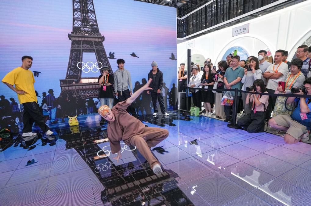 9月14日,在2024年服貿(mào)會(huì)國家會(huì)議中心綜合展區(qū)的主賓國法國展臺(tái),中法兩國街舞好手在表演霹靂舞。新華社記者 陳曄華 攝