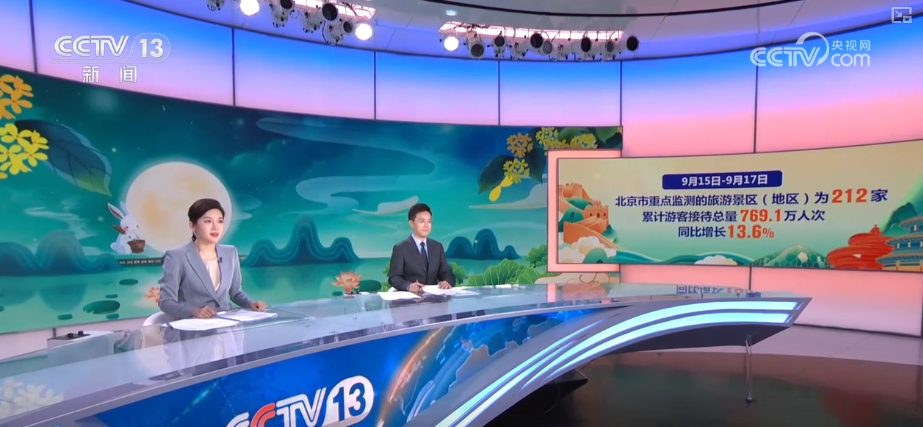 通過數(shù)據(jù)盤點各地出游的情況,北京市文旅局統(tǒng)計,9月15日至17日,北京全市重點監(jiān)測的旅游景區(qū)(地區(qū))為212家,累計游客接待總量769.1萬人次,同比增長13.6%,比2019年增長1.4倍。