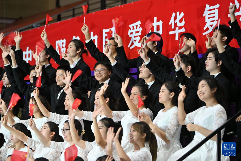 9月21日,南開大學(xué)學(xué)生合唱團(tuán)在現(xiàn)場歡呼。新華社記者 李然 攝