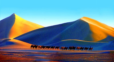 在巴丹吉林沙漠中行進(jìn)的駝隊。趙興忠攝