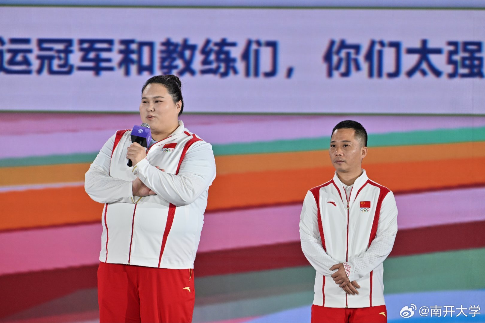 舉重運動員李雯雯和她的教練吳美錦。@南開大學(xué) 圖