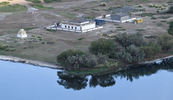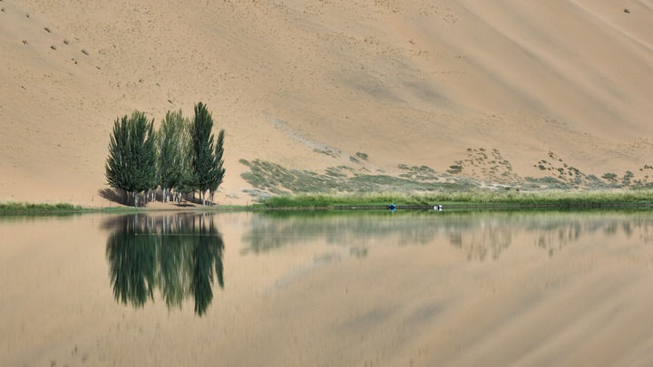 驅(qū)車深入巴丹吉林沙漠,翻過數(shù)不盡的沙丘,來到水草豐美的廟海子。這里四面環(huán)沙山,一座200多年前的白墻金頂寺廟坐落在湖邊,為雄渾壯闊的自然景象抹上一筆濃厚人文氣息。觀者無不感嘆,當年交通不便,如何在沙漠腹地建成如此精美的建筑。