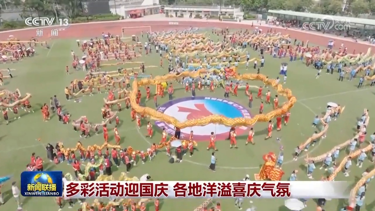 連日來(lái),香港舉行多場(chǎng)活動(dòng)慶祝國(guó)慶。在新界屯門舉行的活動(dòng)中,近80所學(xué)校的師生們舞動(dòng)75只醒獅和180余條彩龍,展現(xiàn)愛(ài)國(guó)、愛(ài)港精神。在維多利亞港海濱舉行了千人大合唱活動(dòng)。