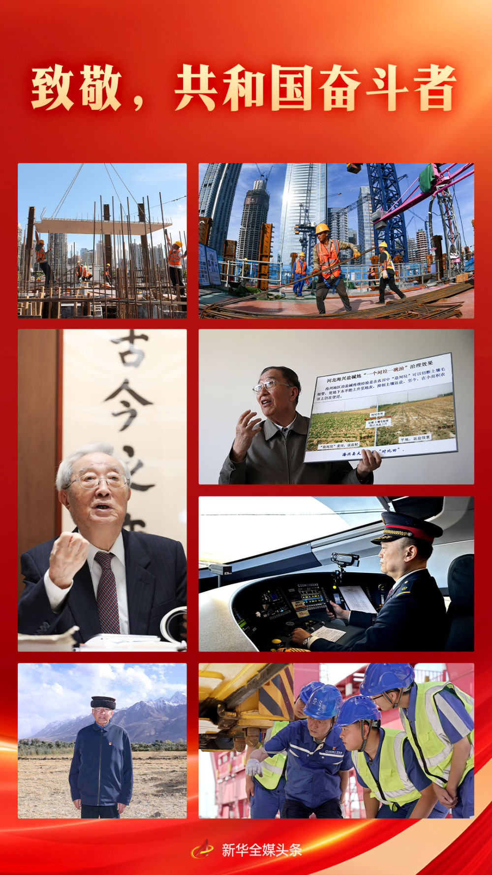 田間地頭、工廠車間、科研一線,在黨的領(lǐng)導(dǎo)下,共和國的奮斗者們勠力同心、開拓進(jìn)取。他們的身影,定格成最美麗的風(fēng)景,匯聚起全面建設(shè)社會主義現(xiàn)代化國家新征程上的磅礴力量?! ?/p>