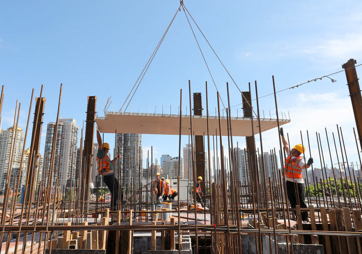 10月3日,中建二局的建設(shè)者在位于上海市中心的一處建筑工地施工。新華社記者 方喆 攝