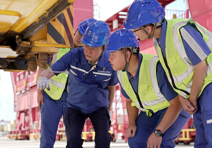 許振超(左二)和團(tuán)隊成員在山東港口青島港集裝箱碼頭研究傳統(tǒng)集裝箱橋吊的智能化升級方案(2024年9月2日攝)。新華社發(fā)(閆軍 攝)
