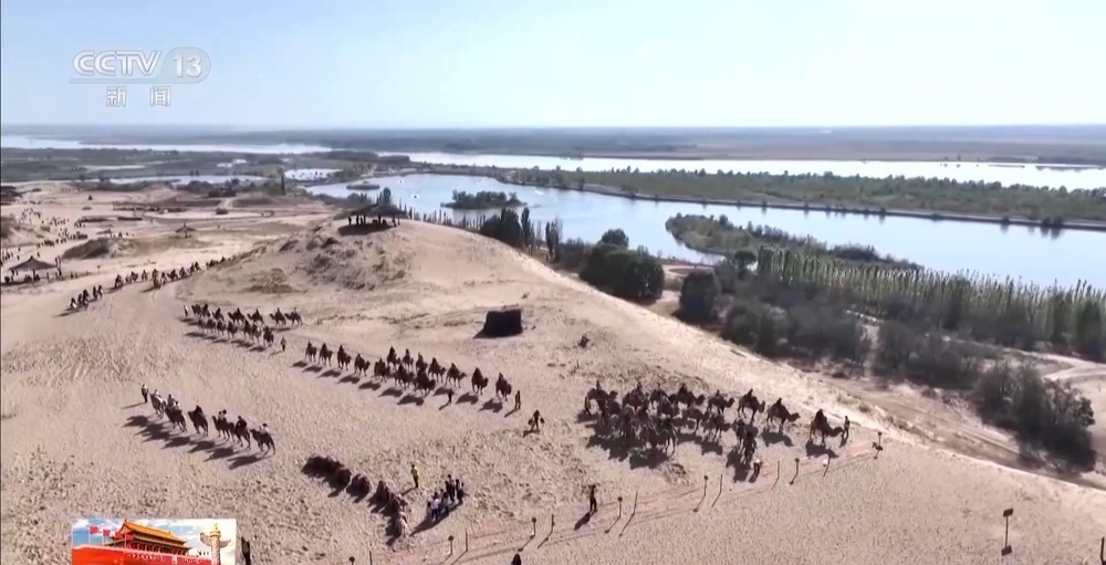 總臺記者 朱達:寧夏銀川市黃沙古渡景區(qū)以一處千年古渡命名,匯集了黃河、沙漠、湖泊、濕地和田園等多種自然風光。十一期間全國各地的游客來到黃沙古渡, 一方面可以欣賞大漠風光、感受黃河文化 ,另一方面可以體驗騎駱駝、沙漠沖浪和飛索等多種項目。