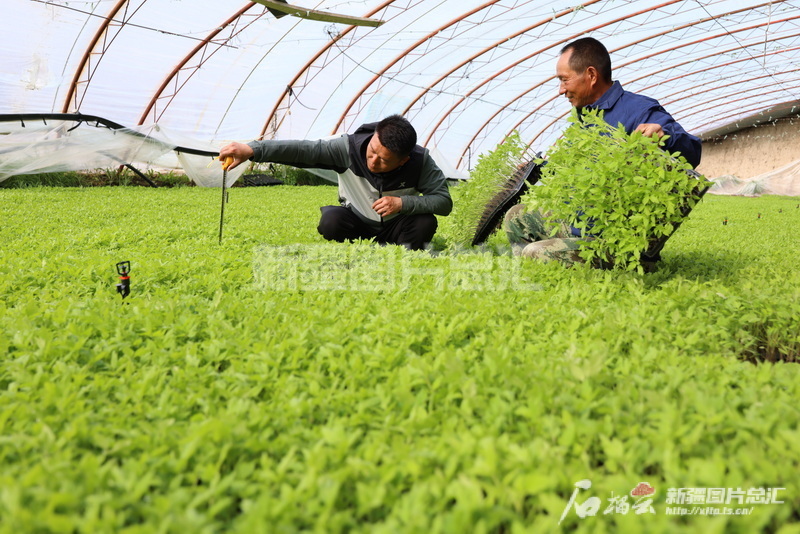 2023年4月17日,新疆生產(chǎn)建設(shè)兵團第五師86團一家種植專業(yè)合作社大棚育苗基地里,農(nóng)技人員指導(dǎo)社員管護蔬菜苗。呂羨林?jǐn)z