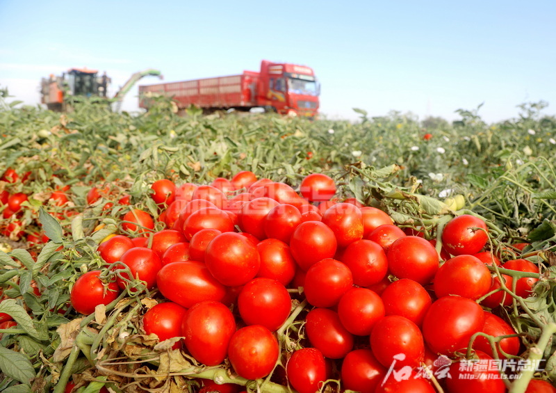 2024年8月15日,在新疆生產(chǎn)建設(shè)兵團第六師101團一塊農(nóng)田里,職工采用機械收獲加工番茄。魏新江攝