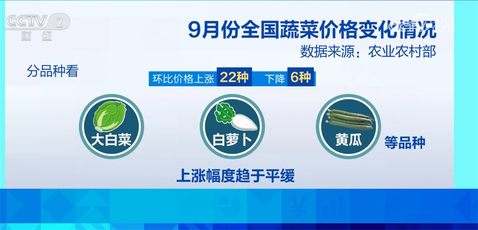 9月份,農(nóng)業(yè)農(nóng)村部重點(diǎn)監(jiān)測的28種蔬菜全國平均批發(fā)價(jià)為每公斤6.23元,環(huán)比上漲6.9%,漲幅收窄14.8個百分點(diǎn),同比上漲22.2%。分品種看,環(huán)比價(jià)格22種上漲、6種下降,其中,青椒、西紅柿、冬瓜價(jià)格漲幅超過20%,8月份價(jià)格漲幅較大的大白菜、白蘿卜、黃瓜等品種在9月份上漲幅度趨于平緩。