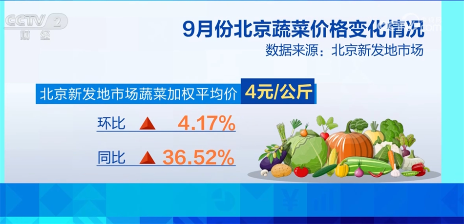 不僅西紅柿,豆角、芹菜、西蘭花等蔬菜也由于產(chǎn)地降雨造成了種植期推遲、上市期延后,近期供應(yīng)偏緊,價(jià)格上漲明顯,像目前芹菜的價(jià)格為每斤3元,比去年同期每斤上漲了2元。整個9月份,北京新發(fā)地市場蔬菜的加權(quán)平均價(jià)為每公斤4元,比8月份上漲4.17%,比去年同期上漲36.52%。