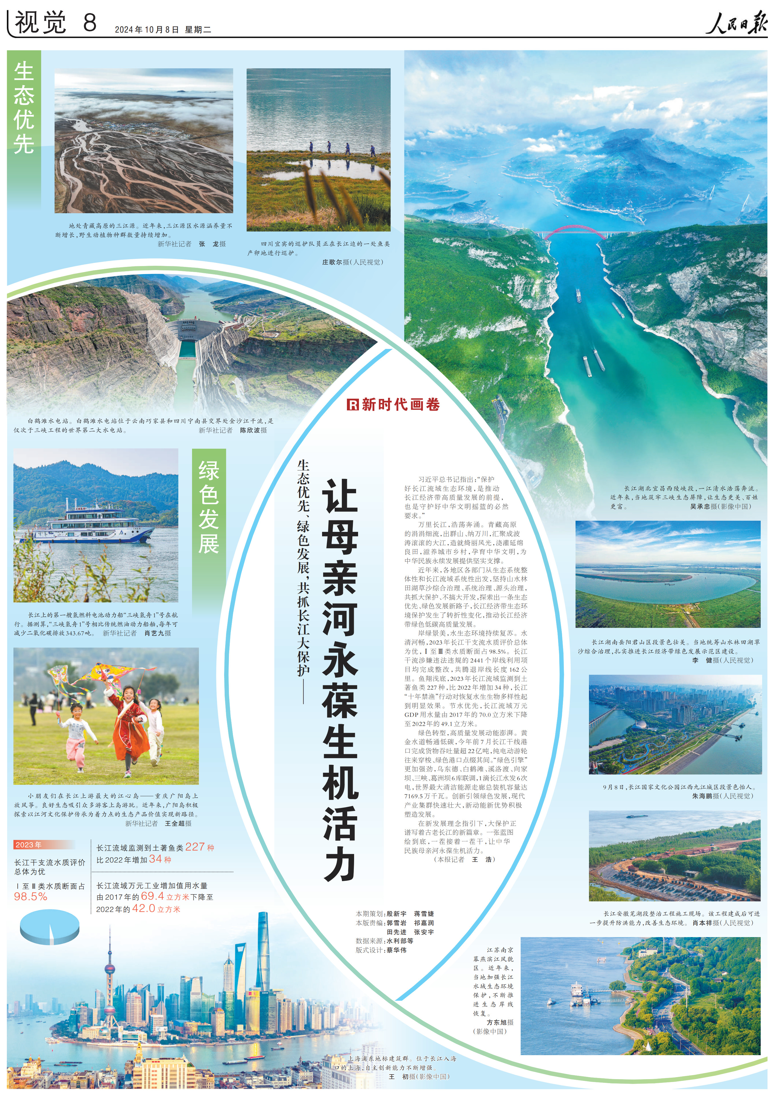 岸綠景美,水生態(tài)環(huán)境持續(xù)復(fù)蘇。水清河暢,2023年長江干支流水質(zhì)評(píng)價(jià)總體為優(yōu),Ⅰ至Ⅲ類水質(zhì)斷面占98.5%。長江干流涉嫌違法違規(guī)的2441個(gè)岸線利用項(xiàng)目均完成整改,共騰退岸線長度162公里。魚翔淺底,2023年長江流域監(jiān)測到土著魚類227種,比2022年增加34種,長江“十年禁漁”行動(dòng)對(duì)恢復(fù)水生生物多樣性起到明顯效果。節(jié)水優(yōu)先,長江流域萬元GDP用水量由2017年的70.0立方米下降至2022年的49.1立方米。