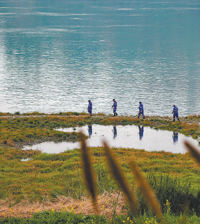 四川宜賓的巡護(hù)隊(duì)員正在長江邊的一處魚類產(chǎn)卵地進(jìn)行巡護(hù)。莊歌爾攝(人民視覺)