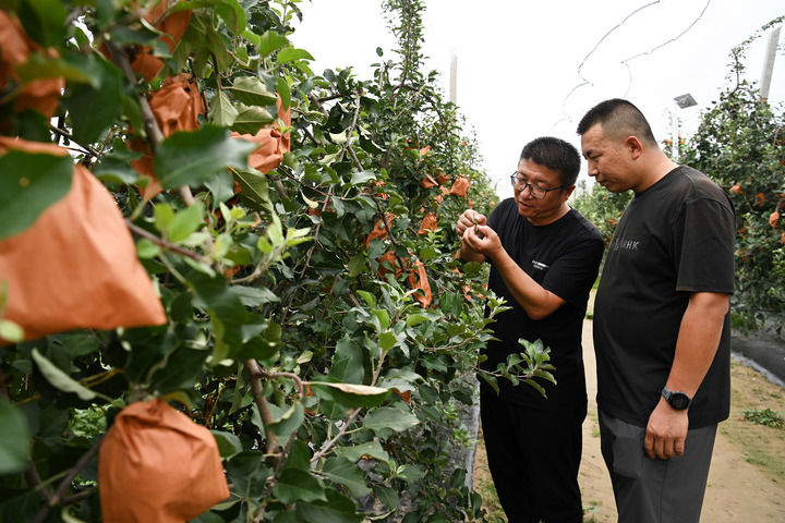 延安市安塞區(qū)果業(yè)技術推廣中心主任張剛(左)在果園觀察果樹長勢(2024年8月8日攝)。新華社記者 鄒競一 攝