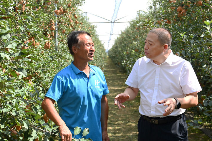 延安市洛川縣槐柏鎮(zhèn)黨委書記解賀宏(右)在果園與果農交流(2024年8月5日攝)。新華社記者 鄒競一 攝