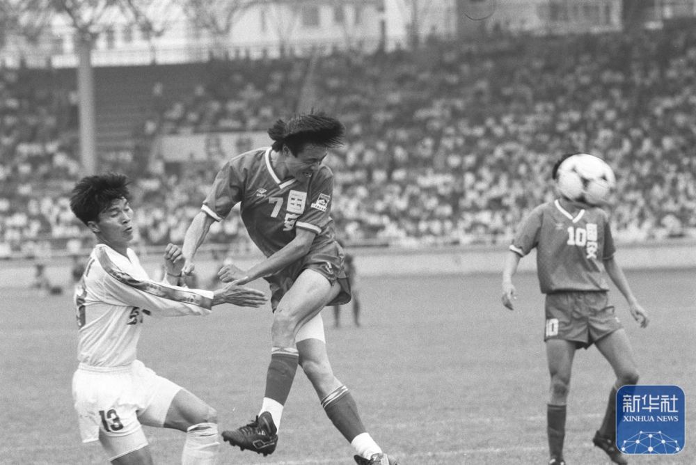 1994是中國(guó)足球職業(yè)化改革元年。這是1994年4月17日,全國(guó)足球甲級(jí)聯(lián)賽全面拉開戰(zhàn)幕。廣東宏遠(yuǎn)俱樂(lè)部隊(duì)主場(chǎng)0比2負(fù)于北京國(guó)安俱樂(lè)部隊(duì),這是國(guó)安隊(duì)7號(hào)謝峰(中)在頭球攻門。 新華社記者 劉彥武攝