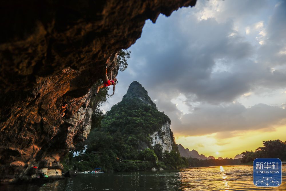 2023年9月5日,攀巖愛好者在廣西桂林市陽(yáng)朔縣進(jìn)行深水抱石。新華社記者 胡星宇 攝