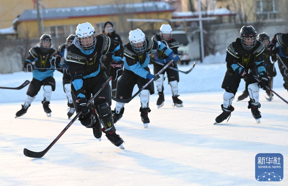 烏魯木齊縣水西溝中學(xué)冰球隊(duì)在訓(xùn)練(2023年12月20日攝)。 新華社記者 李賀 攝
