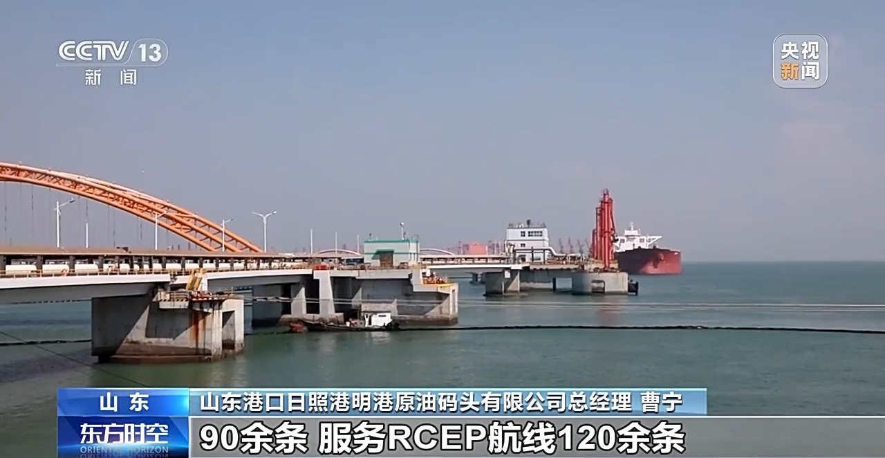山東港口日照港明港原油碼頭有限公司總經理 曹寧:目前有面向共建“一帶一路”國家航線90余條、服務RCEP航線120余條,為我國北方貿易通達全球提供重要助力。