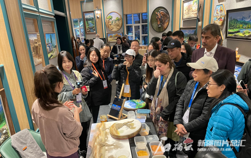 10月15日下午,參加第六屆世界媒體峰會(huì)的外媒代表聽(tīng)沙石畫的“故事”。石榴云/新疆日?qǐng)?bào)記者 郭玲 攝