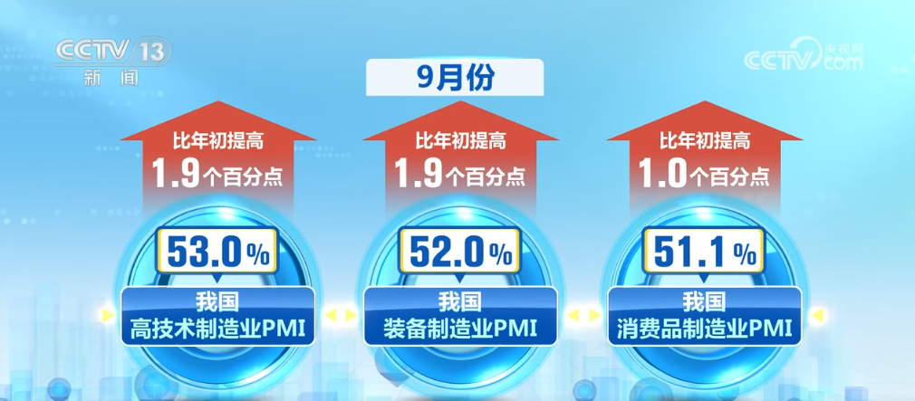 9月份,我國高技術(shù)制造業(yè)、裝備制造業(yè)和消費品制造業(yè)PMI分別為53.0%、52.0%、51.1%,比年初提高了1.9個、1.9個、1.0個百分點。相關(guān)行業(yè)處于擴張區(qū)間,景氣水平連續(xù)上升。